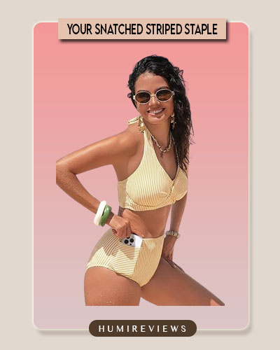 Strolling through a sun-drenched coastal market, I felt like a total vintage dream in this butter-yellow striped set. The twist-front halter top offers the perfect flattering lift, but the real MVP is the functional patch pocket on the high-waisted bottoms—ideal for tucking away a room key during a quick beach-to-cafe transition. It’s the ultimate “sunny day” bikini that pairs retro charm with the modern practicality every girl needs! 🍋🍦✨