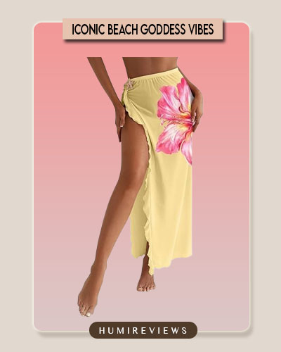 My best friend, Sarah, just got this sarong, and it is a total beach vibe. The pale yellow is so buttery, but that massive pink hibiscus flower and the flirty ruffled slit instantly steal the show. The detachable starfish charm is such a unique, expensive-feeling detail, and she loves how she can pull it down to a full skirt using the elastic waist for casual dinners by the sea! 🌺✨