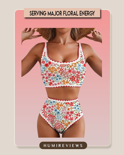 This Herseas bikini set is a vintage lover’s dream, featuring a vibrant floral print accented by trendy red whip-stitch detailing along the edges. The high-waisted bottoms provide excellent tummy coverage and a flattering silhouette that feels secure and comfortable for all-day wear. With its adjustable spaghetti straps and soft, wire-free padding, it’s the perfect blend of retro charm and modern functionality for your next beach escape. 🌸🧵✨