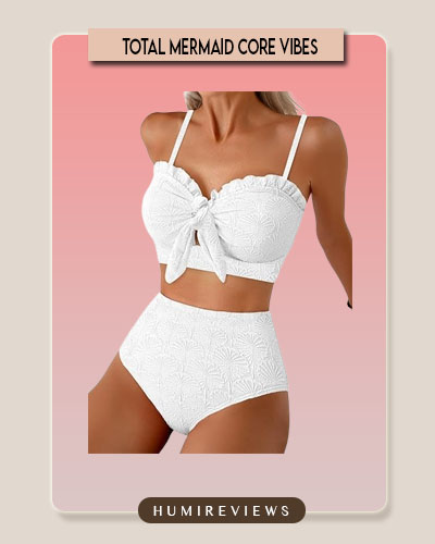 This Herseas bikini set stands out with its unique seashell-textured fabric and a flirty ruffle trim along the sweetheart neckline. The knotted front provides a natural push-up effect, while the detachable, adjustable straps offer multiple styling options from a classic two-shoulder look to a sleek bandeau. Paired with high-waisted bottoms that gently conceal the tummy, it’s a sophisticated and comfortable choice for making a statement at any resort or beach. 🐚✨